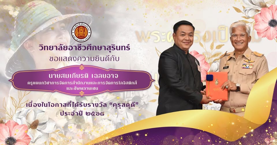 นายสมเกียรติ เฉลยอาจ ครูแผนกวิชาการจัดการสำนักงานและการจัดการโลจิสติกส์และซัพพลายเชน วิทยาลัยอาชีวศึกษาสุรินทร์ ที่ได้รับรางวัลคุรุสดุดี ประจำปี ๒๕๖๘