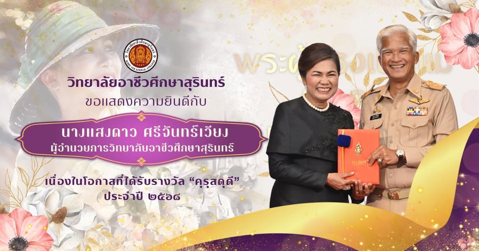 นางแสงดาว ศรีจันทร์เวียง ผู้อำนวยการวิทยาลัยอาชีวศึกษาสุรินทร์ ที่ได้รับรางวัลคุรุสดุดี ประจำปี ๒๕๖๘ ในพิธีมอบรางวัลเชิดชูเกียรติผู้บริหาร ครูและบุคลากรทางการศึกษา ผู้ประกอบวิชาชีพทางการศึกษา เนื่องในงานวันครู ประจำปี ๒๕๖๙