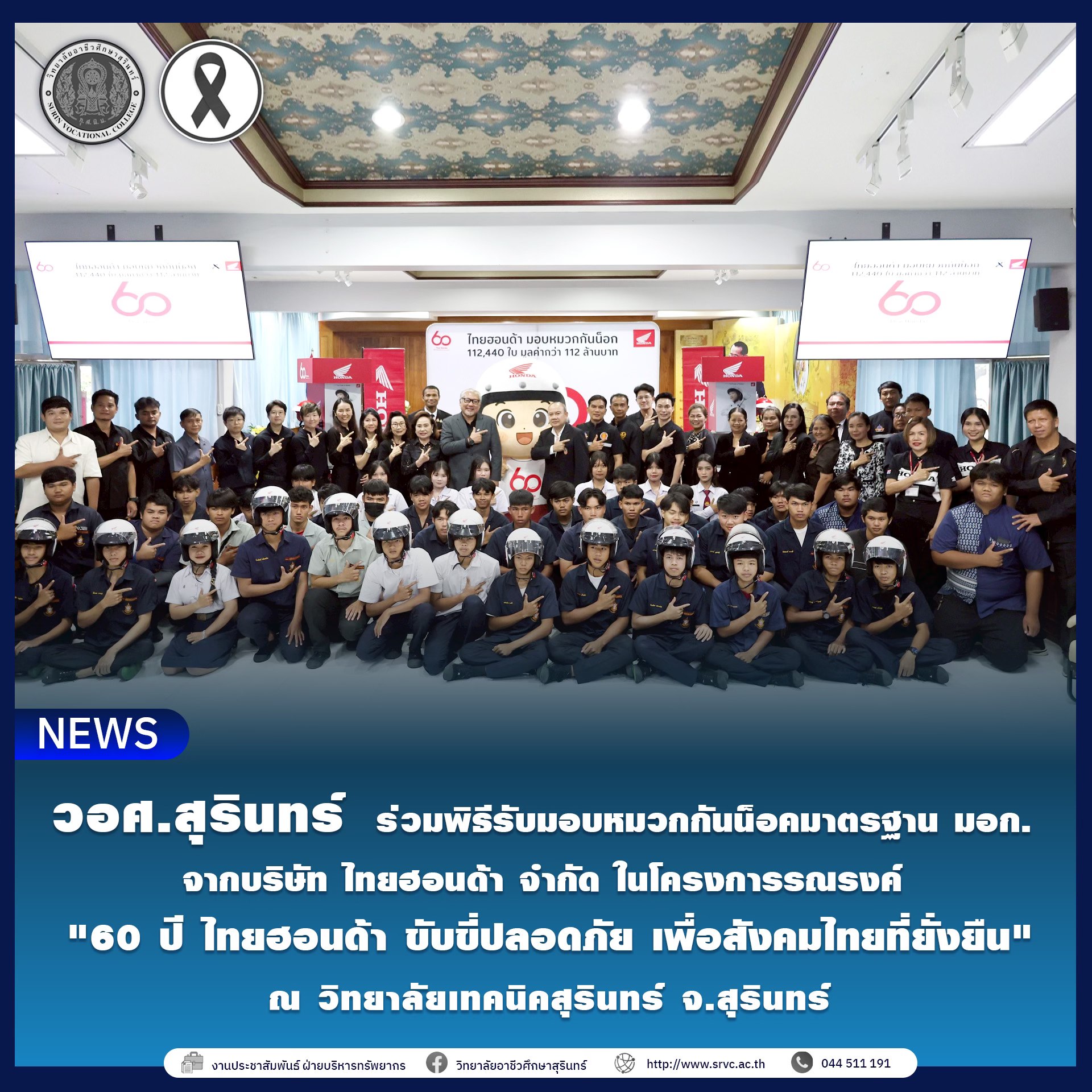 วอศ. สุรินทร์ ร่วมพิธีรับมอบหมวกกันน็อคมาตรฐาน มอก. จากบริษัท ไทยฮอนด้า จำกัด ในโครงการรณรงค์ "60 ปี ไทยฮอนด้า ขับขี่ปลอดภัย เพื่อสังคมไทยที่ยั่งยืน" ณ วิทยาลัยเทคนิคสุรินทร์