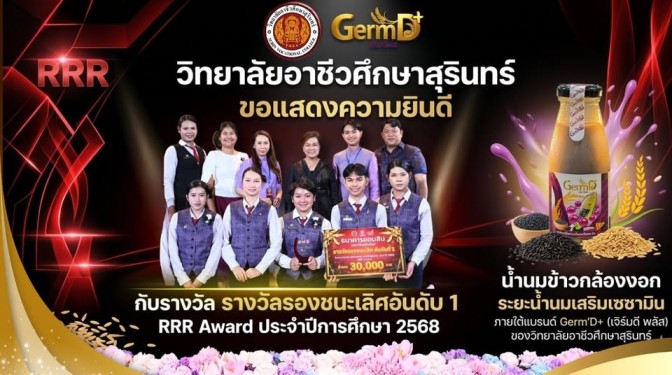 รางวัลรองชนะเลิศอันดับ 1 RRR Award ประจำปีการศึกษา 2568 วิทยาลัยอาชีวศึกษาสุรินทร์ ขอแนะนำสุดยอดนวัตกรรมเครื่องดื่มเพื่อสุขภาพ 🌾 "น้ำนมข้าวกล้องงอกระยะน้ำนมเสริมเซซามิน" ภายใต้แบรนด์ Germ‘D+ (เจิร์มดี พลัส)