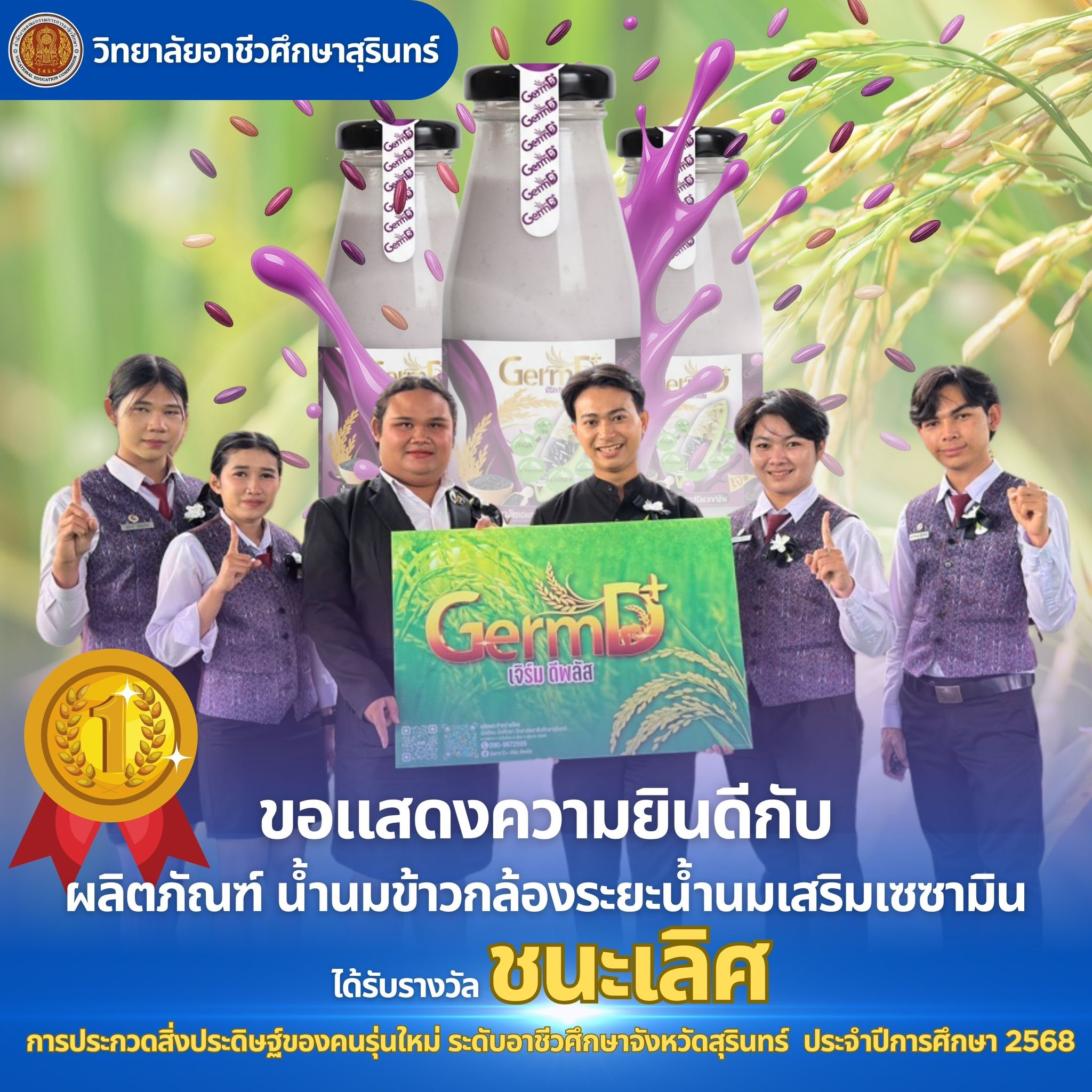 ผลิตภัณฑ์ น้ำนมข้าวกล้องระยะน้ำนมเสริมเซซามิน ได้รับรางวัลชนะเลิศ การประกวดสิ่งประดิษฐ์ของคนรุ่นใหม่ ระดับอาชีวศึกษาจังหวัดสุรินทร์ ประจำปีการศึกษา 2568