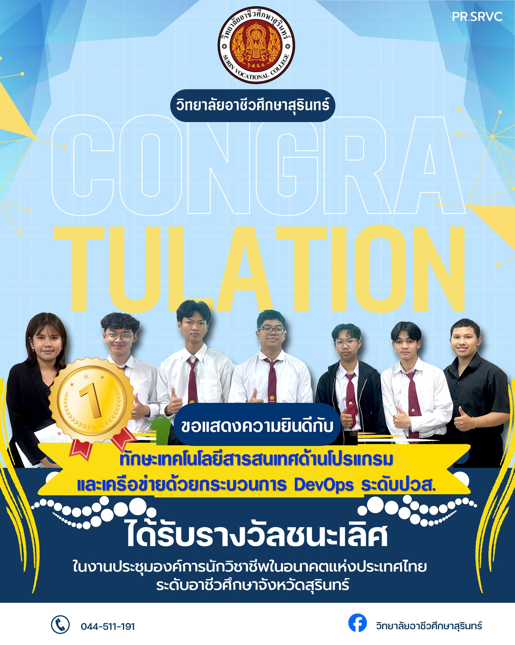 ทักษะเทคโนโลยีสารสนเทศด้านโปรแกรมและเครือข่ายด้วยกระบวนการ DevOps ระดับปวส. ได้รับรางวัลชนะเลิศ และเป็นตัวแทนไปแข่งขันในระดับภาคตะวันออกเฉียงเหนือในงานประชุมองค์การนักวิชาชีพในอนาคตแห่งประเทศไทย ระดับอาชีวศึกษาจังหวัดสุรินทร์