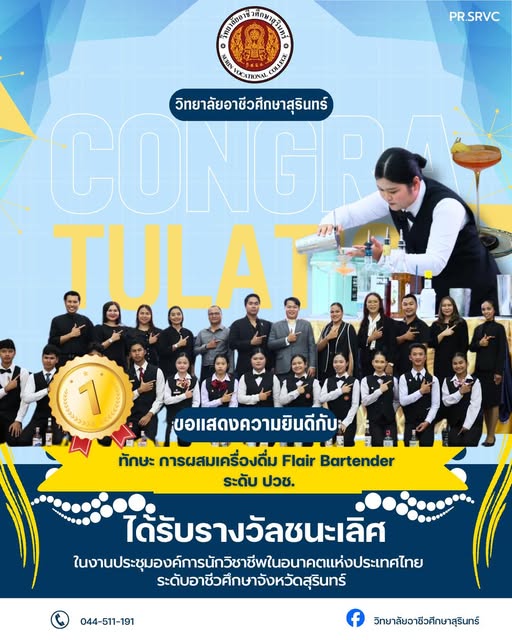 ทักษะการผสมเครื่องดื่ม Flair Bartender ระดับปวช. ได้รับรางวัลชนะเลิศ และเป็นตัวแทนไปแข่งขันในระดับภาคตะวันออกเฉียงเหนือ ในงานประชุมองค์การนักวิชาชีพในอนาคตแห่งประเทศไทย ระดับอาชีวศึกษาจังหวัดสุรินทร์