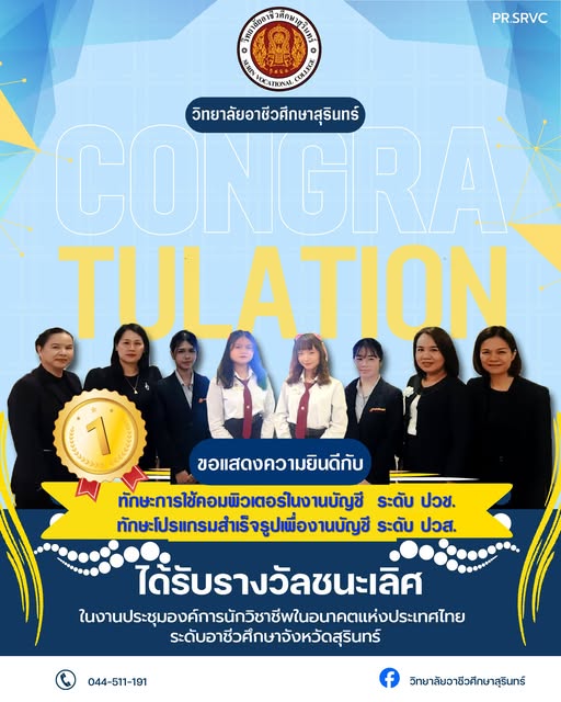 ทักษะการใช้คอมพิวเตอร์ในงานบัญชี ระดับปวช. ทักษะโปรแกรมสำเร็จรูปเพื่องานบัญชี ระดับปวส. ได้รับรางวัลชนะเลิศ และเป็นตัวแทนไปแข่งขันในระดับภาคตะวันออกเฉียงเหนือในงานประชุมองค์การนักวิชาชีพในอนาคตแห่งประเทศไทย ระดับอาชีวศึกษาจังหวัดสุรินทร์