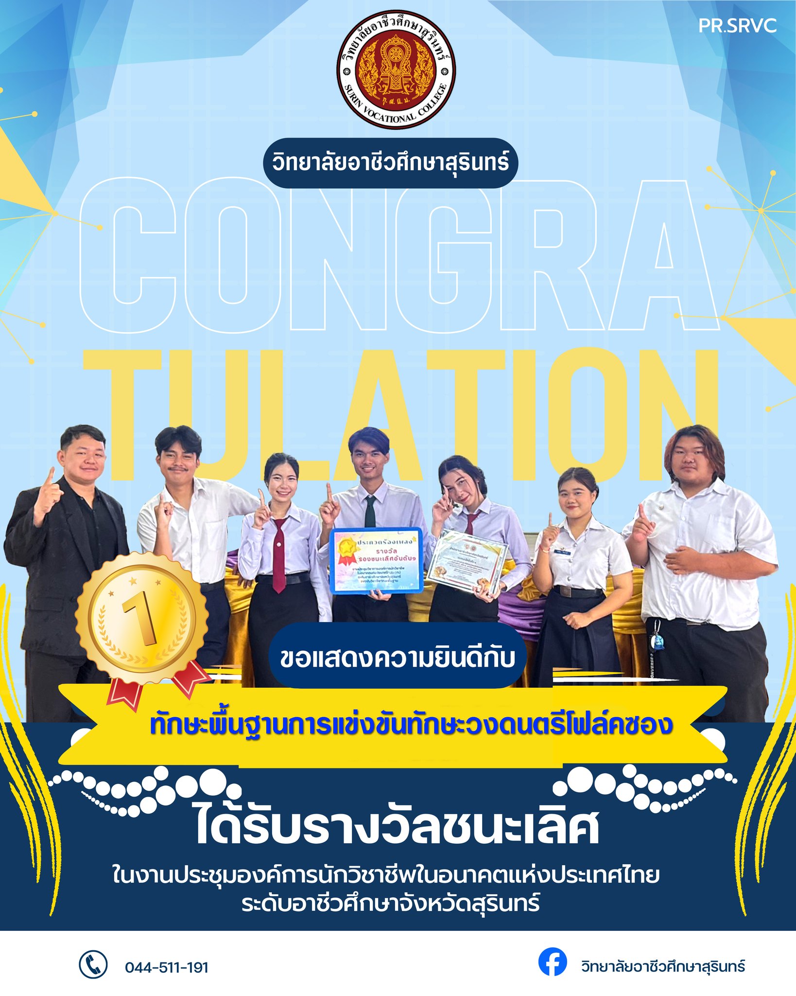 ทักษะพื้นฐษนการแข่งขันทักษะวงดนตรีโฟล์คซอง ได้รับรางวัลชนะเลิศ และเป็นตัวแทนไปแข่งขันในระดับภาคตะวันออกเฉียงเหนือ ในงานประชุมองค์การนักวิชาชีพในอนาคตแห่งประเทศไทย ระดับอาชีวศึกษาจังหวัดสุรินทร์
