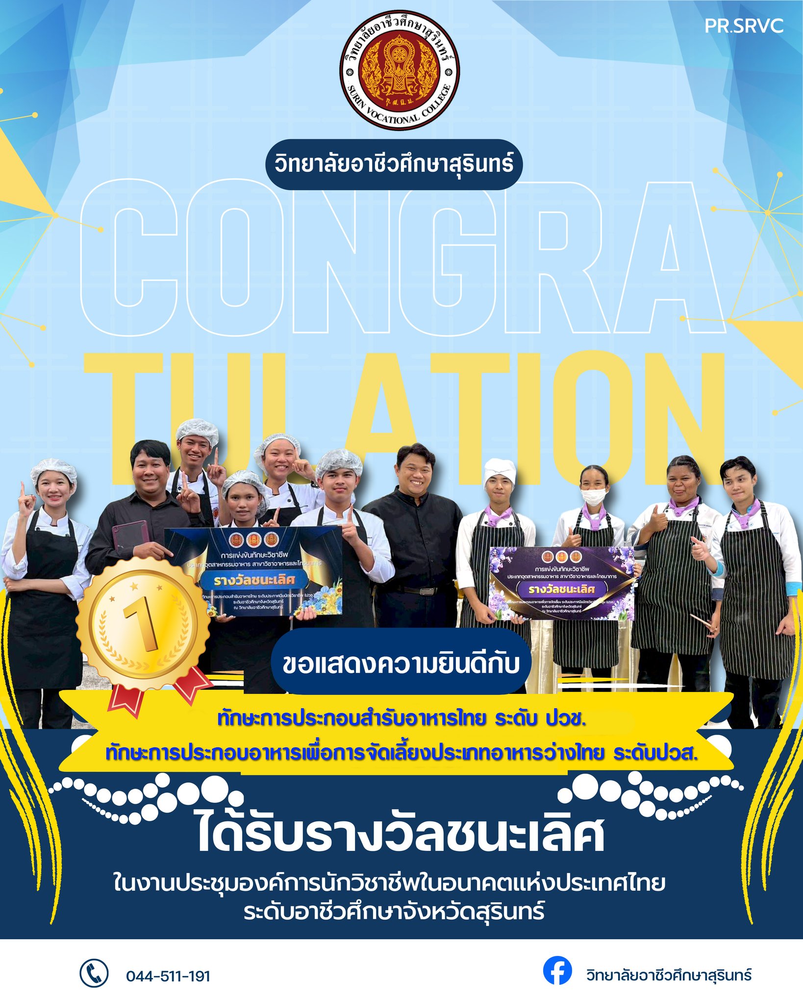 ทักษะการประกอบสำรับอาหารไทย ระดับปวช. ทักษะการประกอบอาหารเพื่อการจัดเลี้ยงประเภทอาหารว่างไทย ระดับปวส. ได้รับรางวัลชนะเลิศ และเป็นตัวแทนไปแข่งขันในระดับภาคตะวันออกเฉียงเหนือ ในงานประชุมองค์การนักวิชาชีพในอนาคตแห่งประเทศไทย ระดับอาชีวศึกษาจังหวัดสุรินทร์